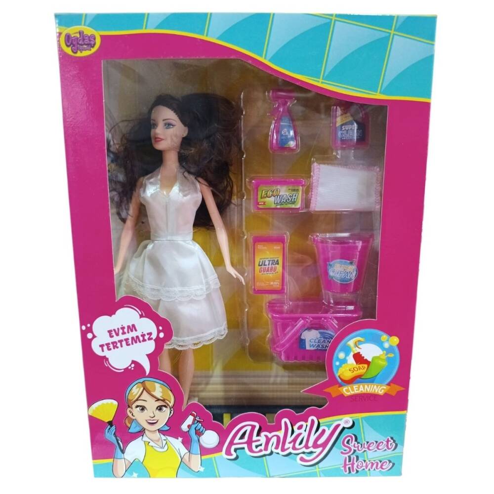Oydaş Anlılıy Kutuda Temizlik Setli Bebek-Kahve Saçlı Beyaz Elbise